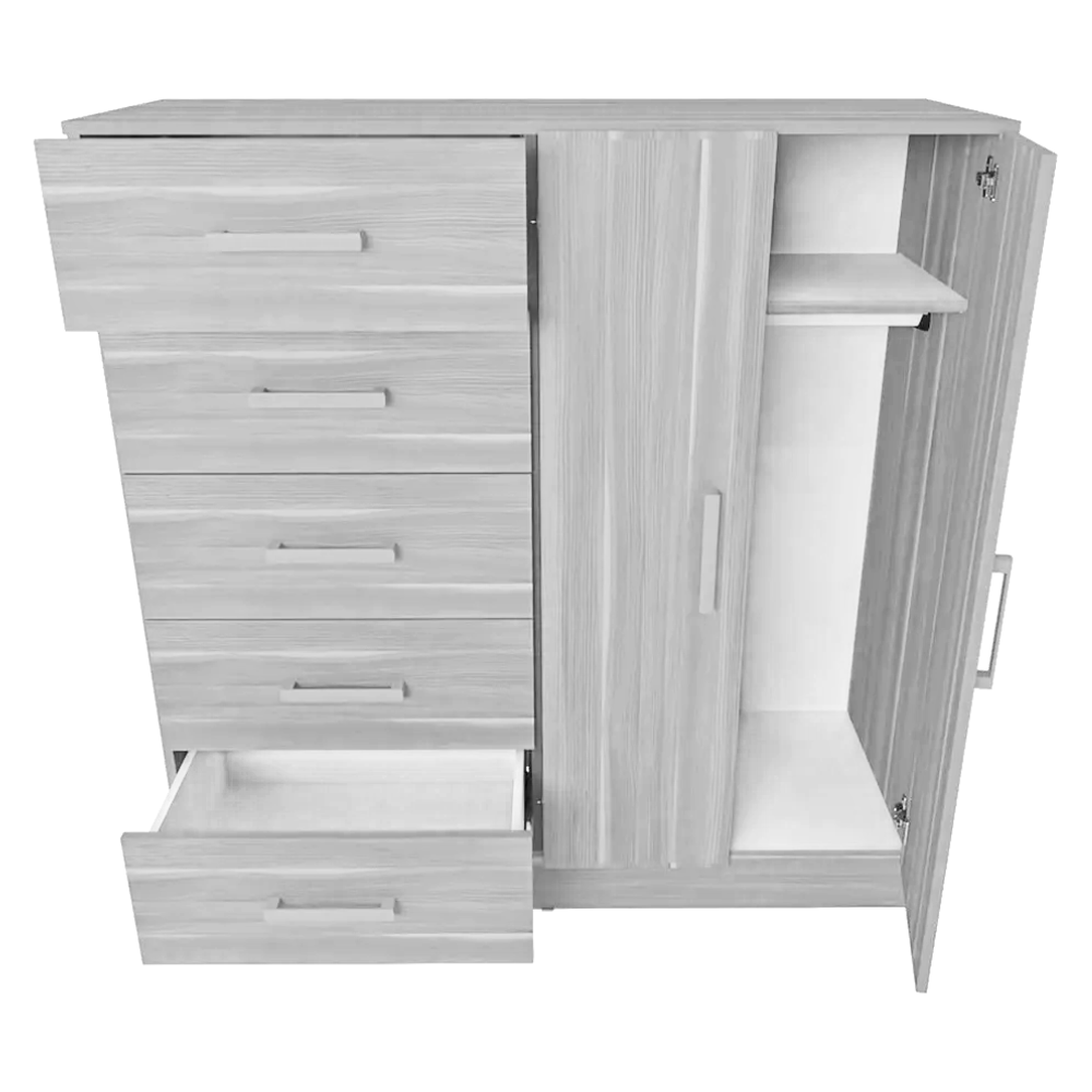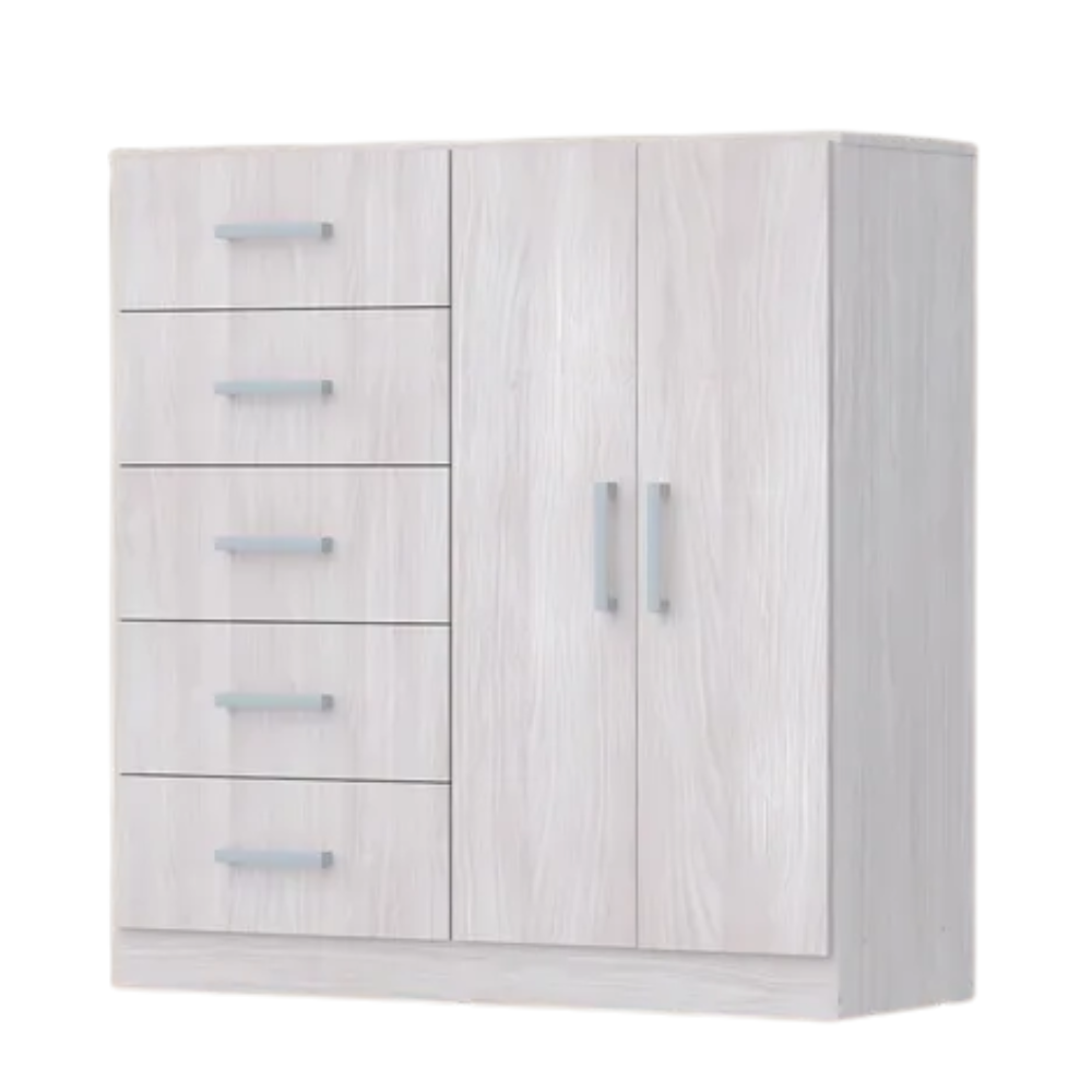 Chiffonier amplio y funcional, ideal para organizar ropa y accesorios en el dormitorio. Su combinación de cajones y puertas permite aprovechar mejor el espacio de guardado.