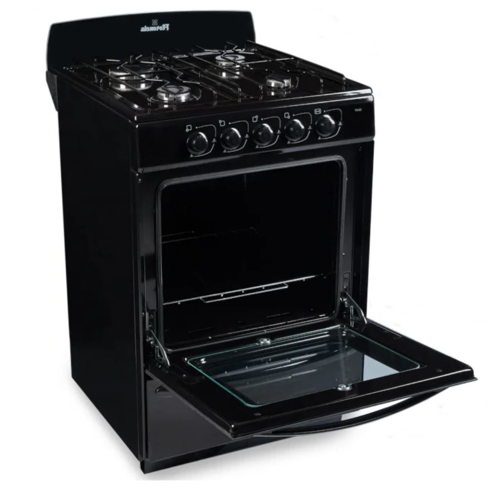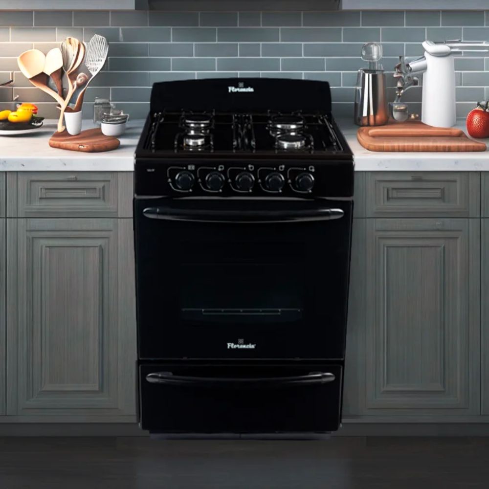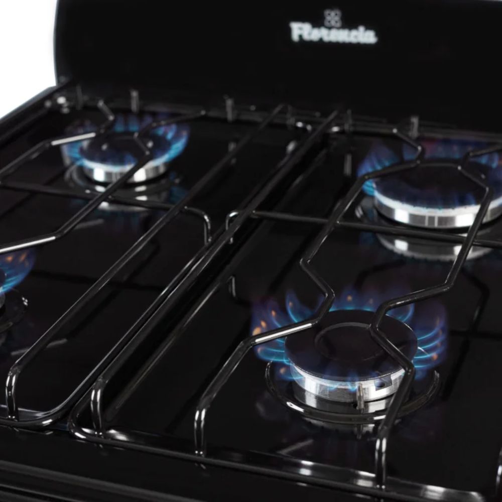 Esta cocina Florencia en color negro combina 4 hornallas, horno con visor y doble cristal, con formato de 56 cm y sistema multigas para mayor flexibilidad de instalación.