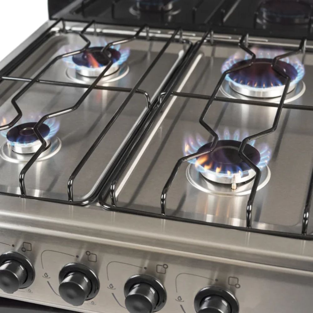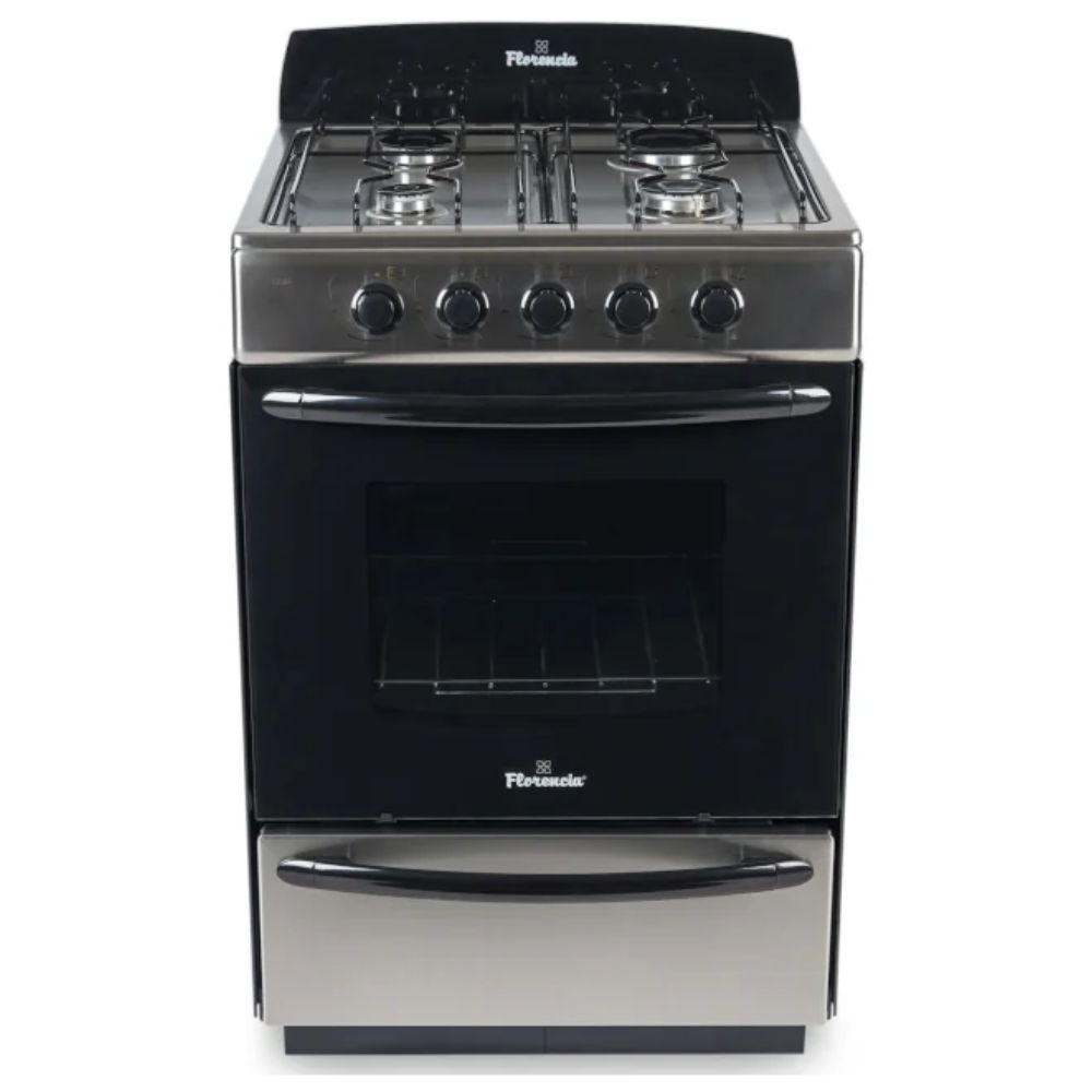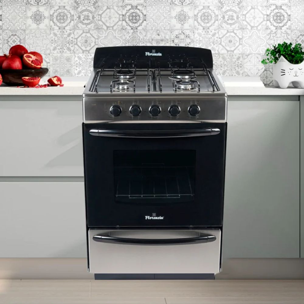 Diseño más moderno y terminación resistente para una cocina de todos los días ✨ La Florencia 5518F combina frente de acero inoxidable, 4 hornallas, horno con visor y doble cristal, con sistema multigas para adaptarse a red o garrafa.