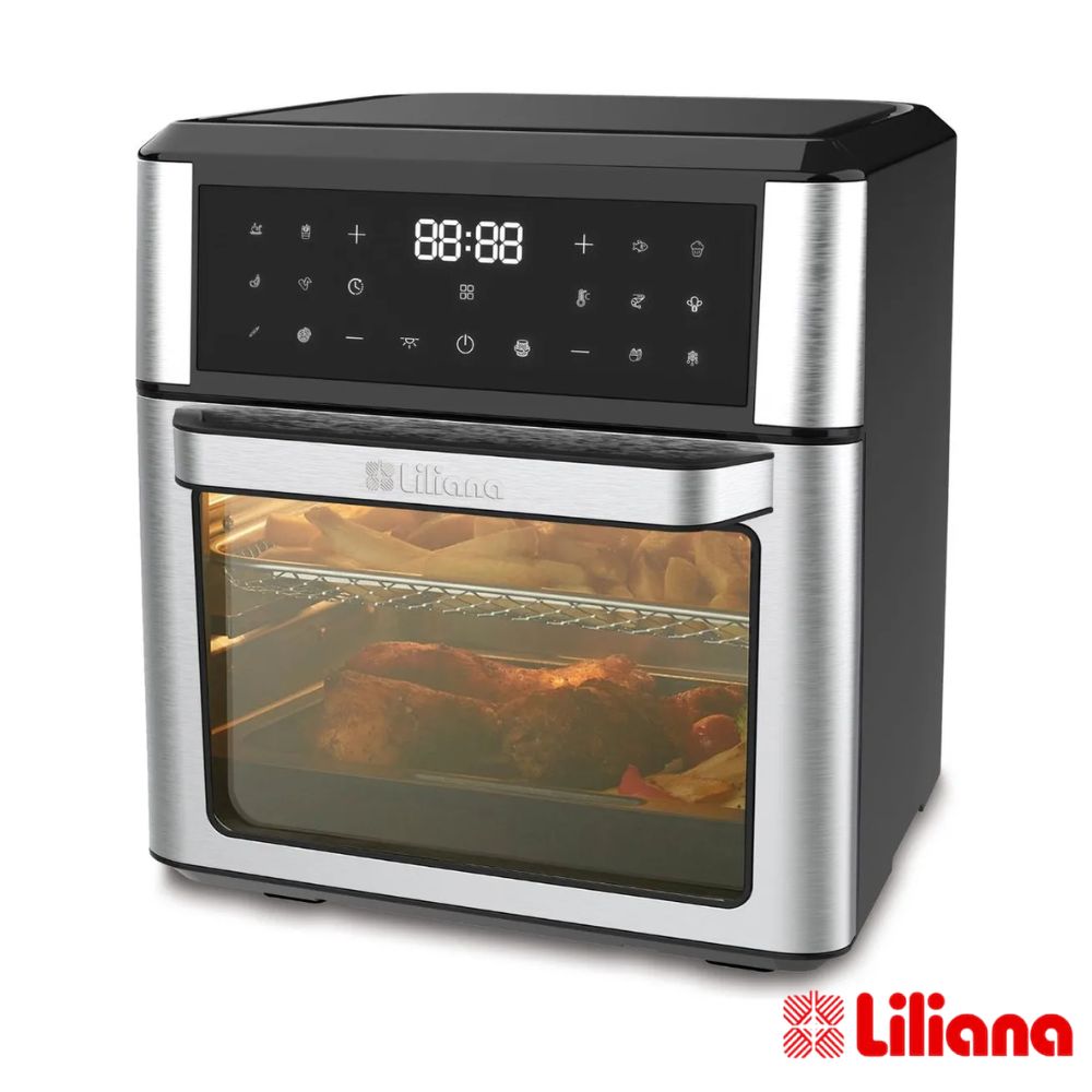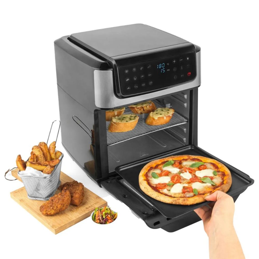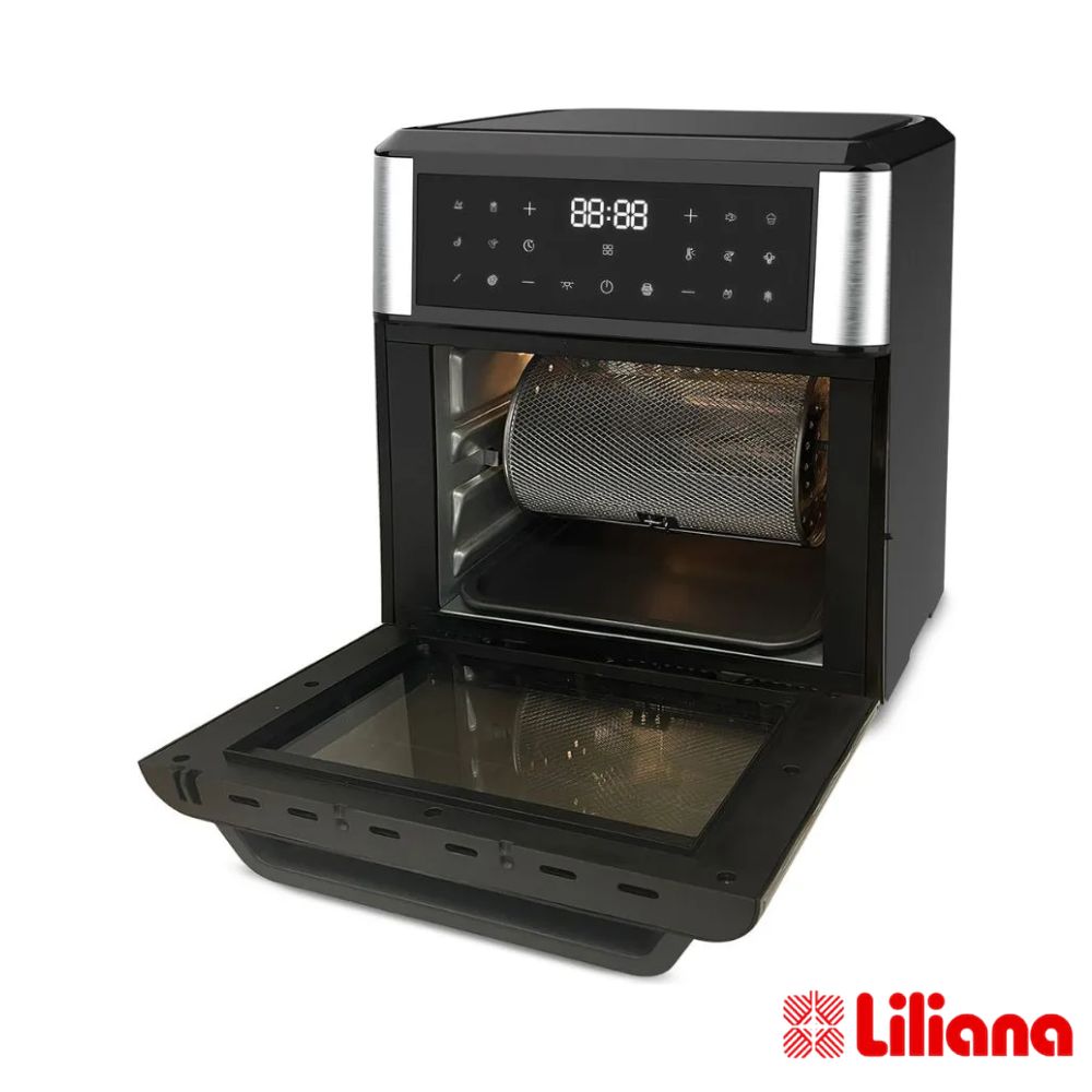 Freidora de aire tipo horno con gran capacidad, ideal para cocinar comidas crocantes y saludables con poco o nada de aceite.
