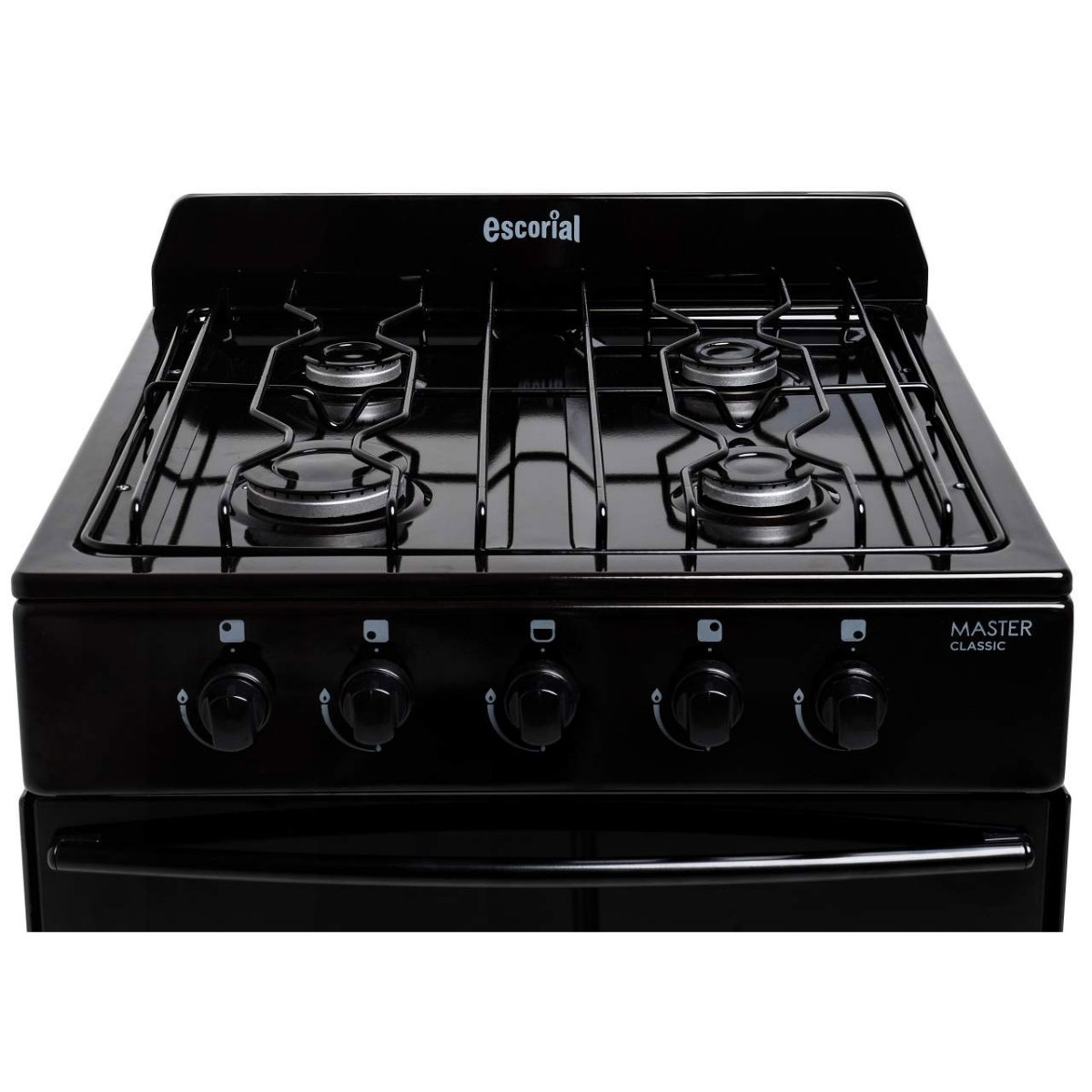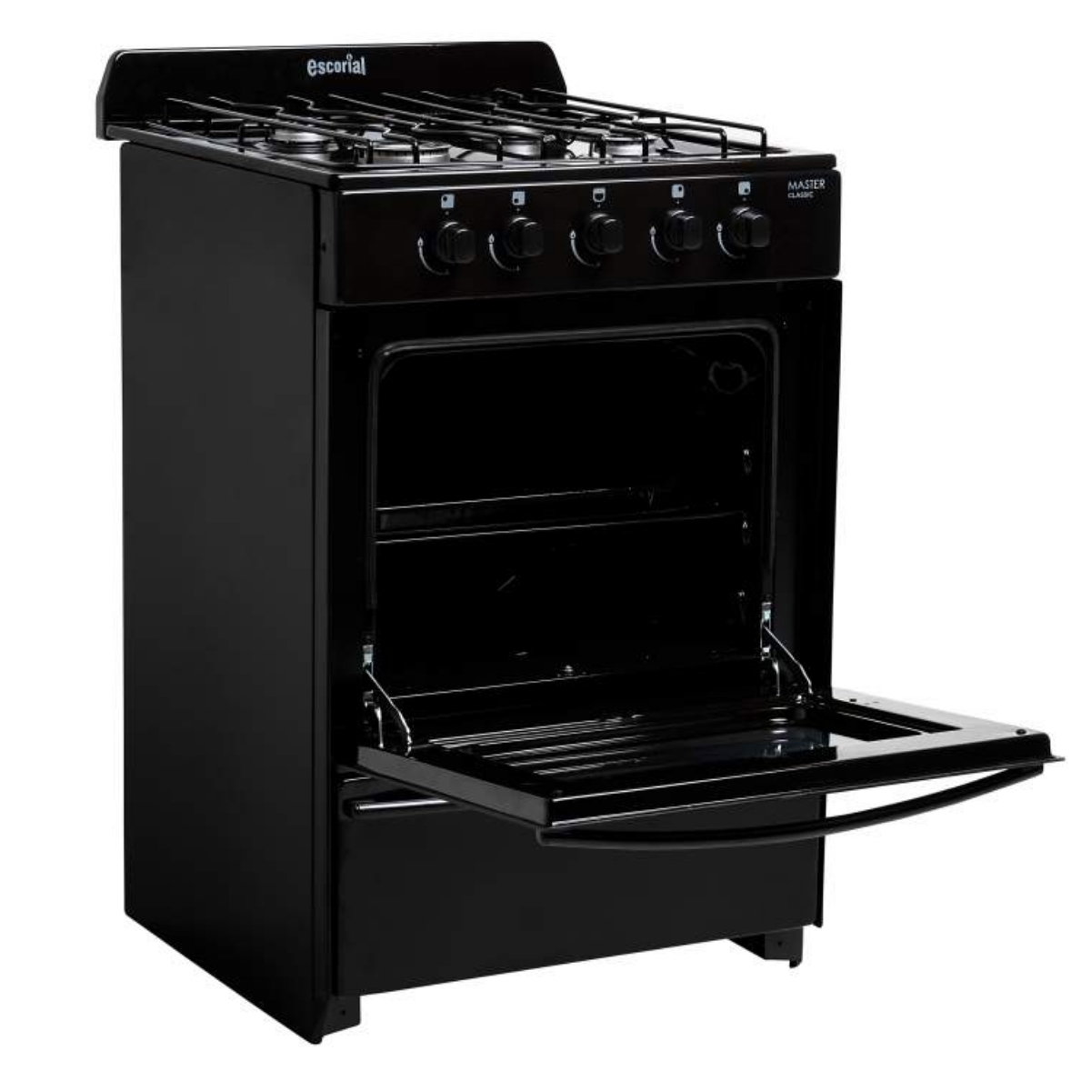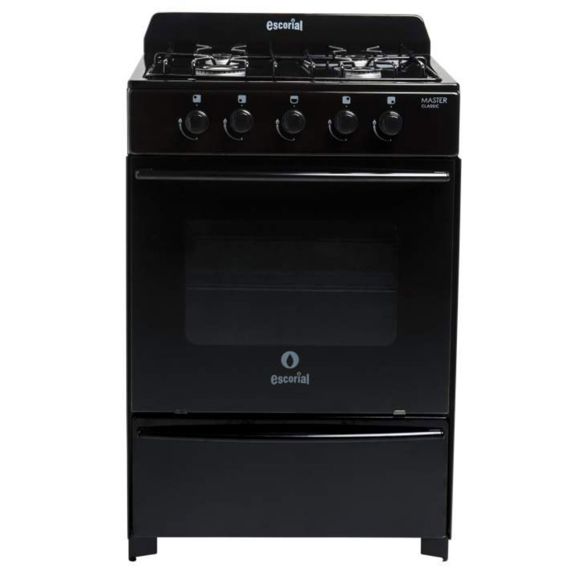 La cocina Escorial Master Classic negra de 56 cm es robusta y elegante, con horno visor y válvula de seguridad, para gas envasado.