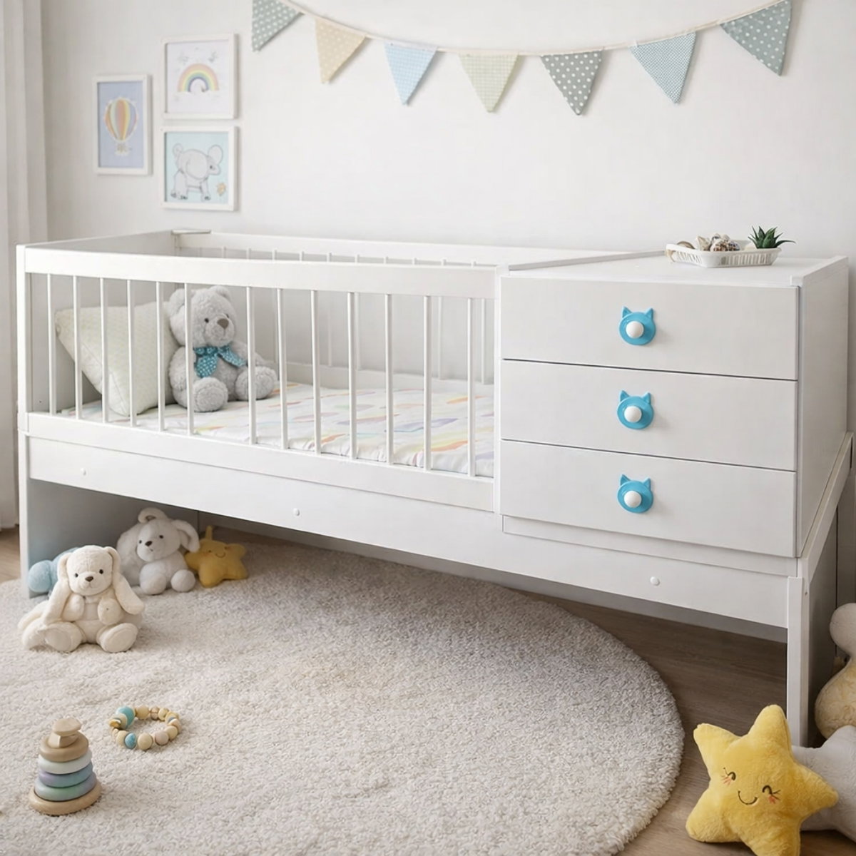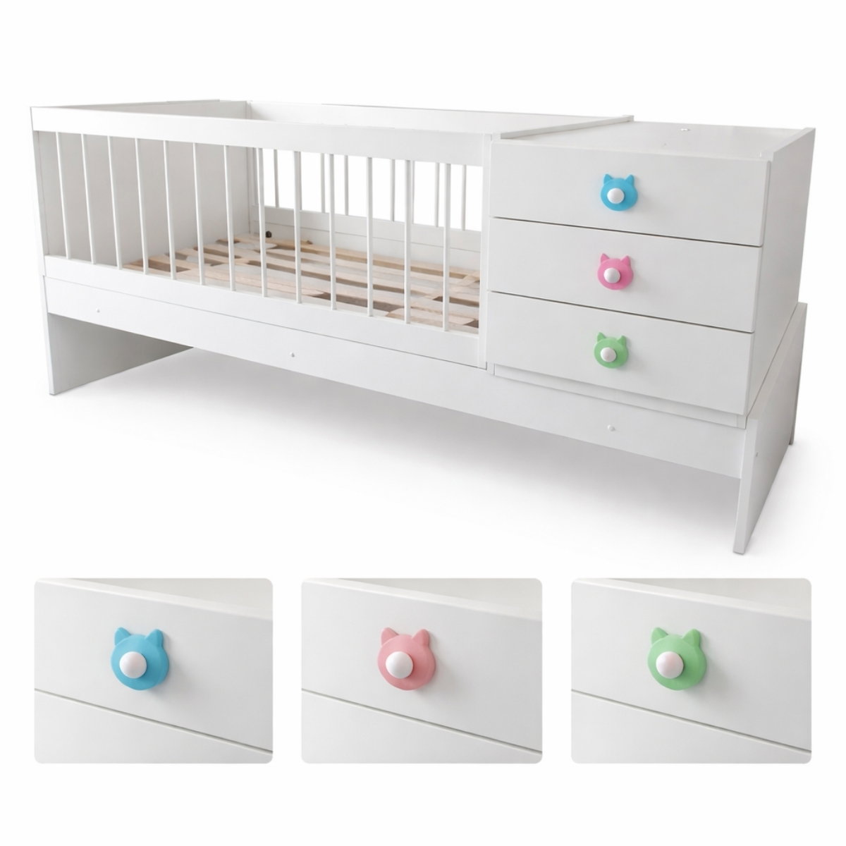 Cuna funcional de melamina convertible, ideal para acompañar el crecimiento de tu bebé. Segura y duradera.