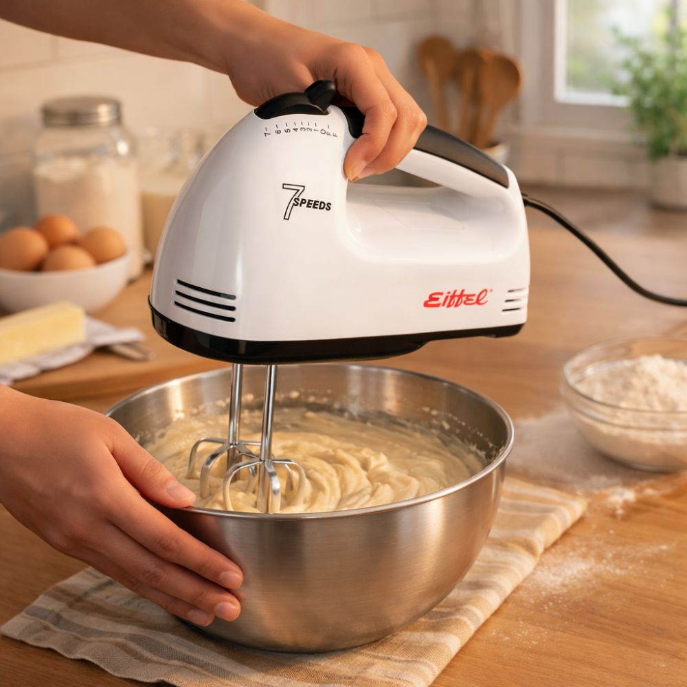 Batidora eléctrica práctica y liviana ideal para preparaciones de repostería y mezclas caseras.
