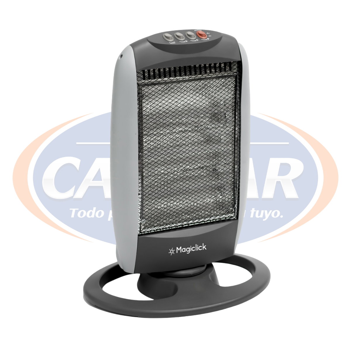 Estufa halógena giratoria de 3 velas. El giro distribuye el calor en un ángulo amplio, cubriendo mayor superficie sin necesidad de moverla.