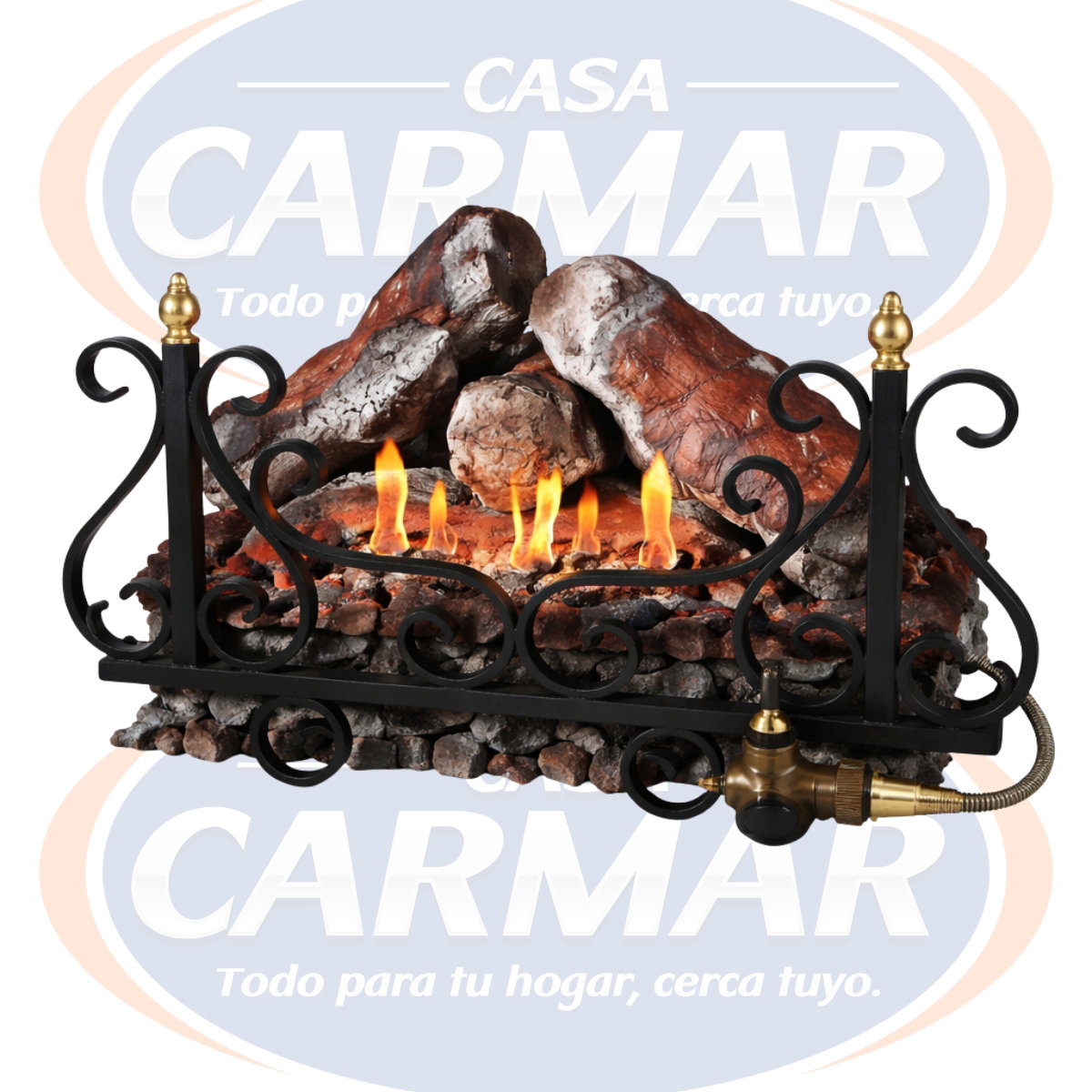 Leño decorativo a gas con encendido incorporado. Brinda el ambiente cálido y visual de una chimenea real sin el mantenimiento de la leña.