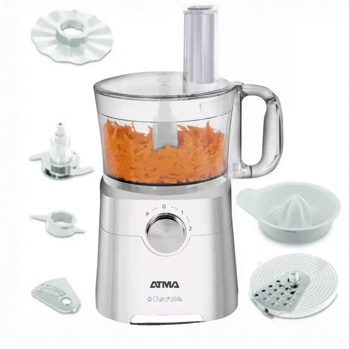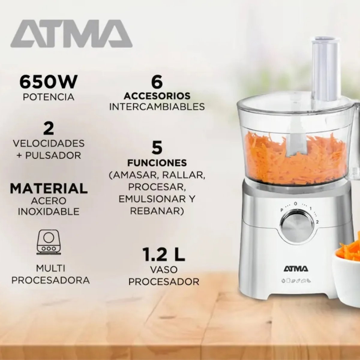 Multiprocesadora Atma de 650W con 2 velocidades y accesorios para picar, mezclar y procesar en segundos.