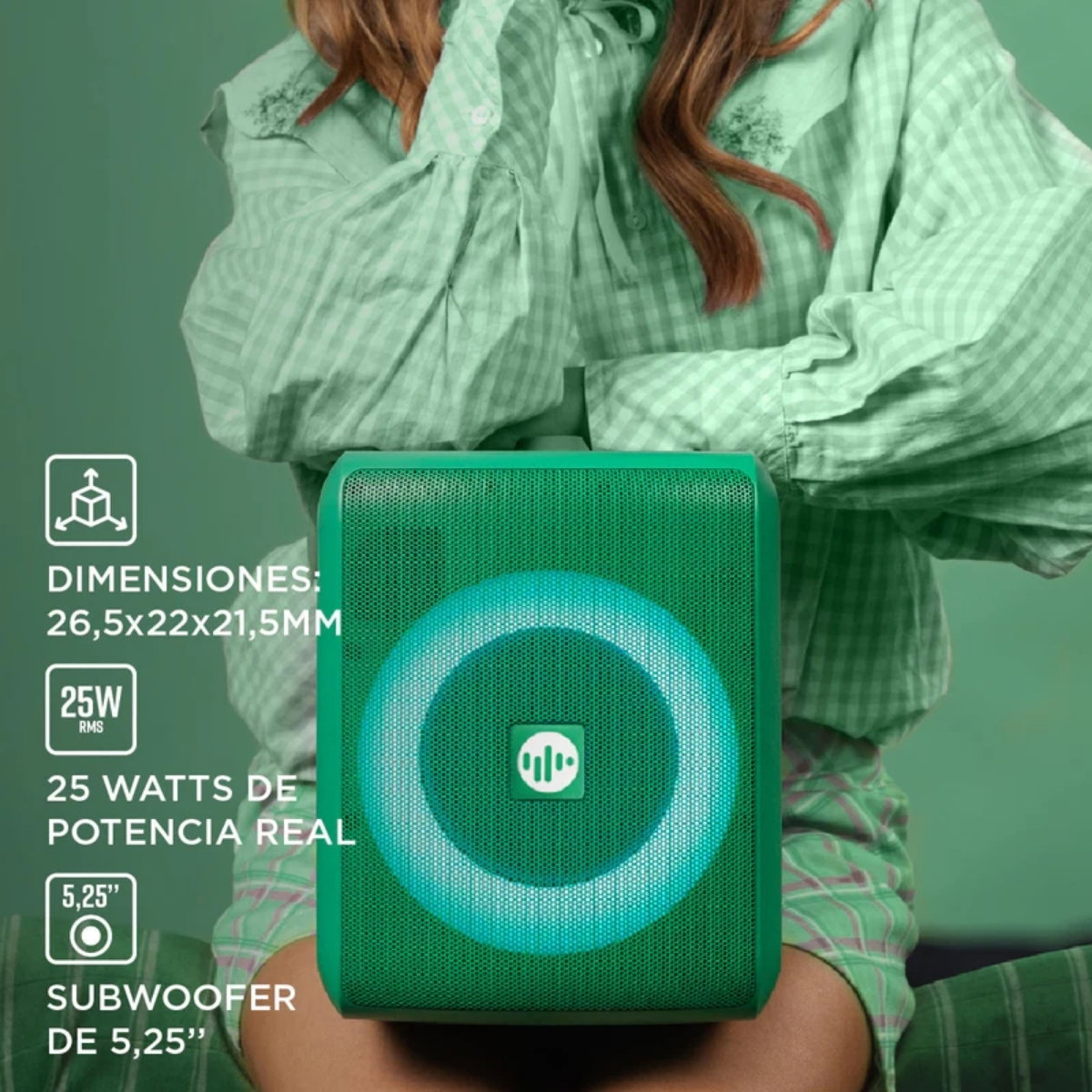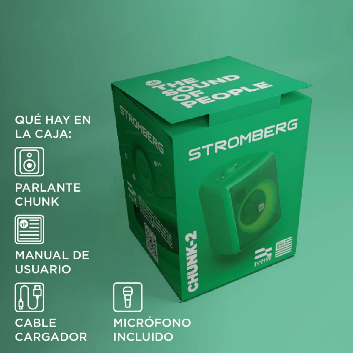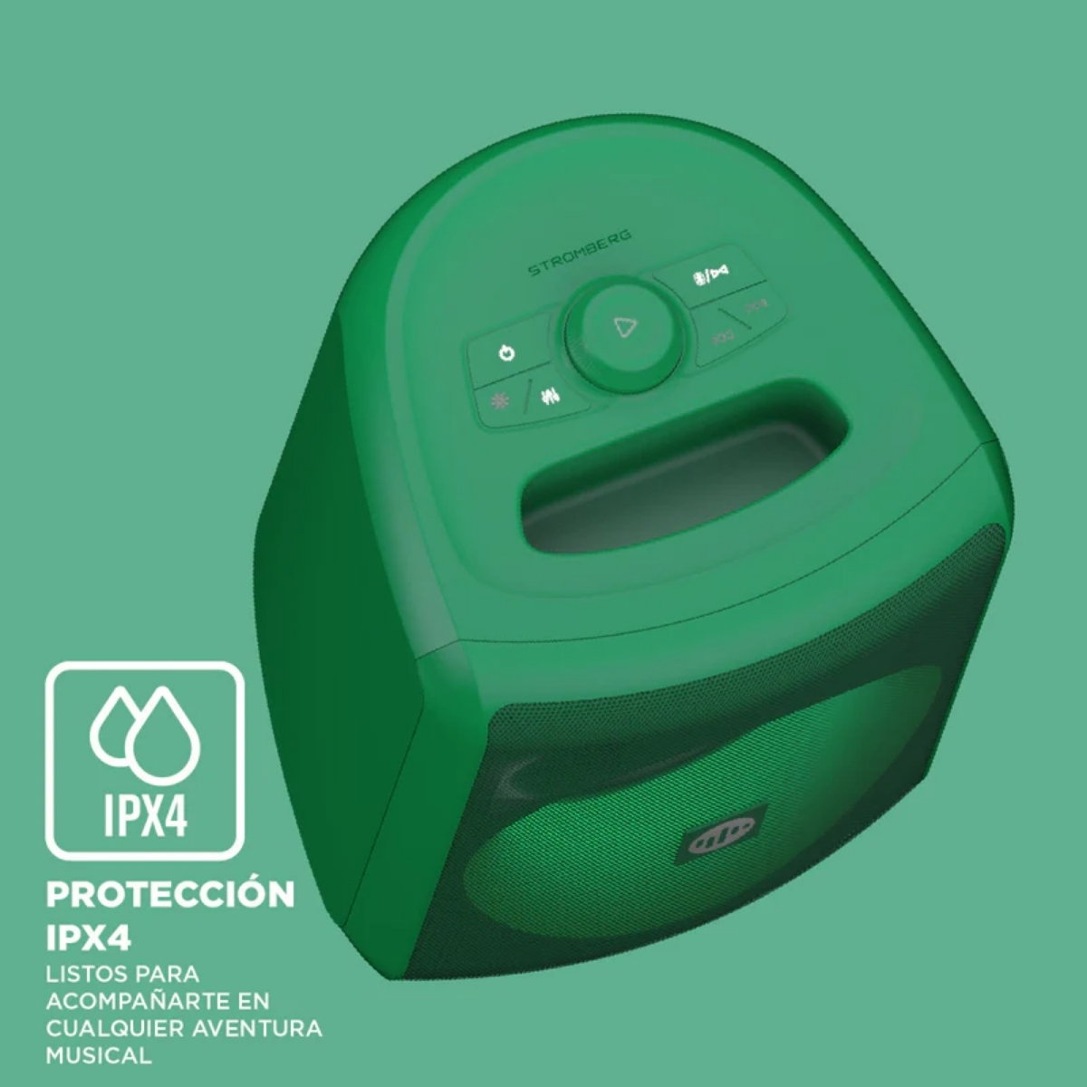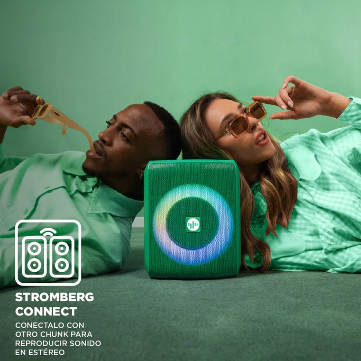 Parlante Stromberg Chunk de 10" con potente sonido grave. Diseño llamativo en color verde para fiestas.