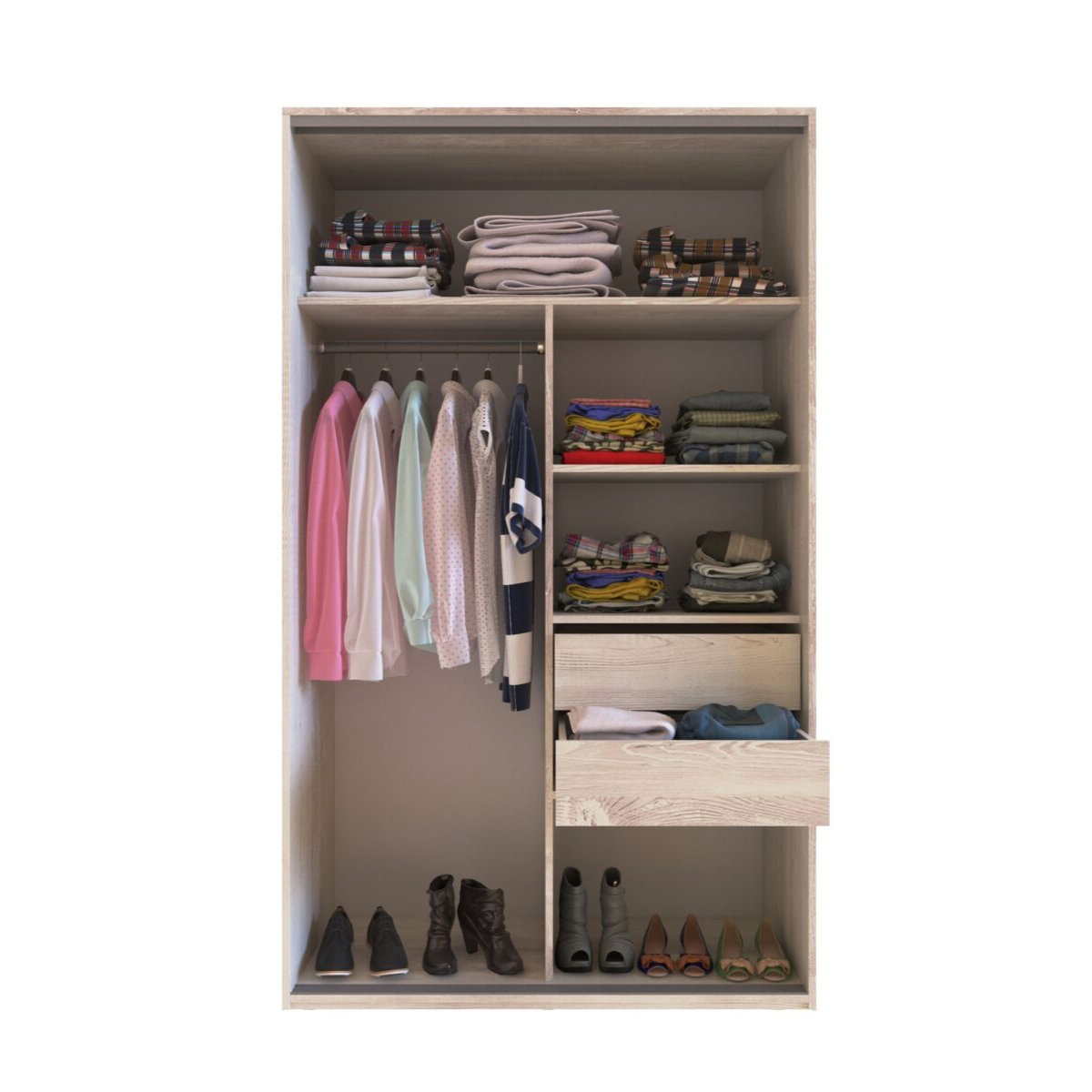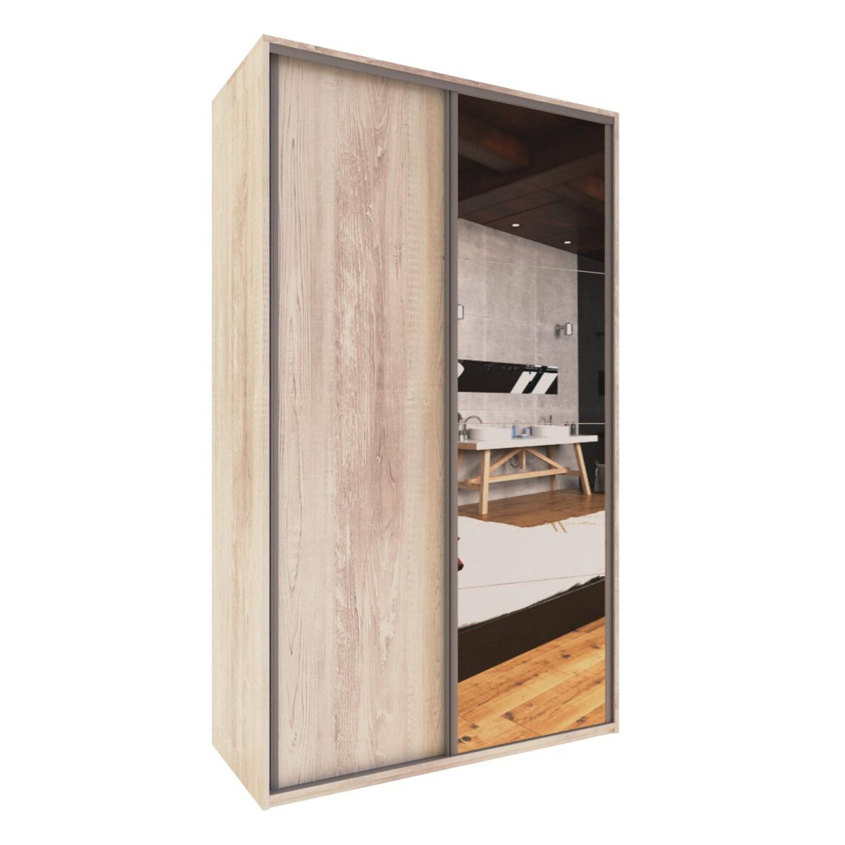 Placard Delos Reflex de 1,20 m con 2 puertas corredizas y espejo. Organización completa con cajones y estantes. Color Pino Cascina.