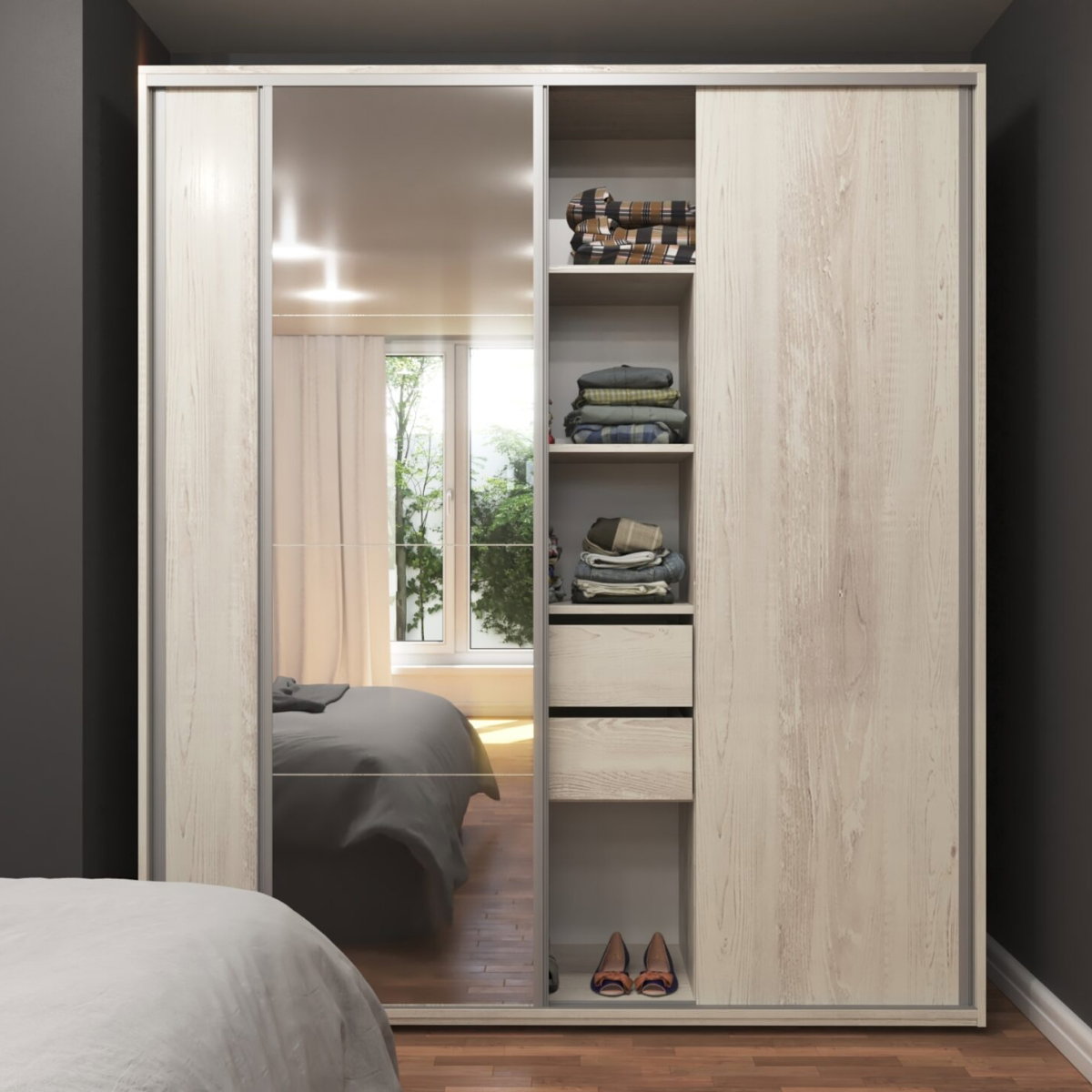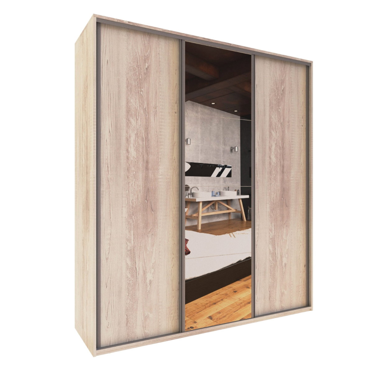 Placard Delos Reflex de 1,80 m con 3 puertas corredizas y espejo central. Amplio espacio de guardado. Color Pino Cascina.